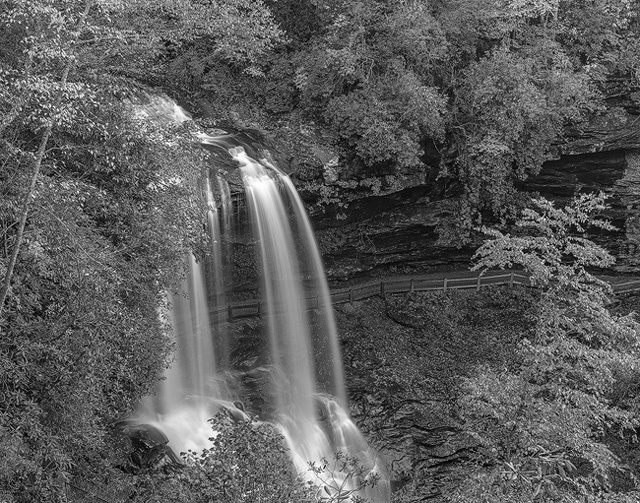 Item Dry Falls11x14. Dry Falls flows on the Cullasaja River through the Nantahala National Forest. It is part of a series of waterfalls on a 8.7-mile (14 km) stretch of the river that eventually ends with Cullasaja Falls. Dry Falls flows over an overhanging bluff that allows visitors to walk up under the falls and remain relatively dry when the waterflow is low, hence its name.